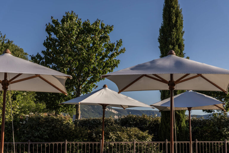 C’est aussi un restaurant avec 2 grandes salles et 3 terrasses : côté village, à l’ombre des platanes, côté Château et enfin le Bar-Terrasse sous les arcades de pierre des anciennes écuries.