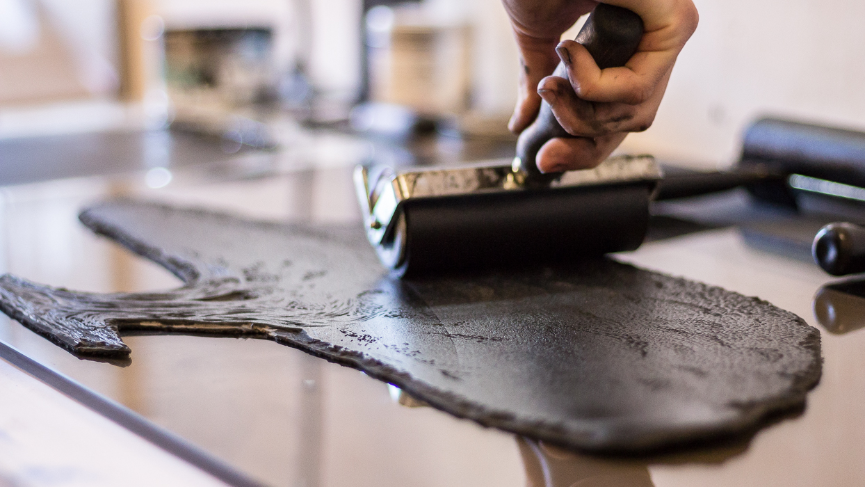 Le principe, c’est de graver un dessin dans une plaque de « linoléum ». À base d’huile de lin (d’où son nom), ce matériau contient aussi de la poudre de liège, de la gomme et de la résine, le tout comprimé sur une toile de jute pour former des plaques. Pour graver les plaques, on utilise des petits outils, les gouges.