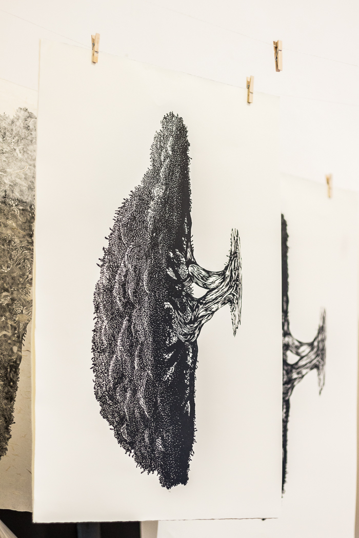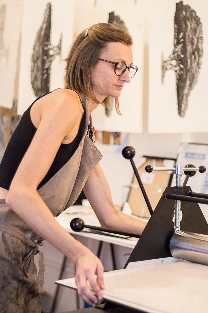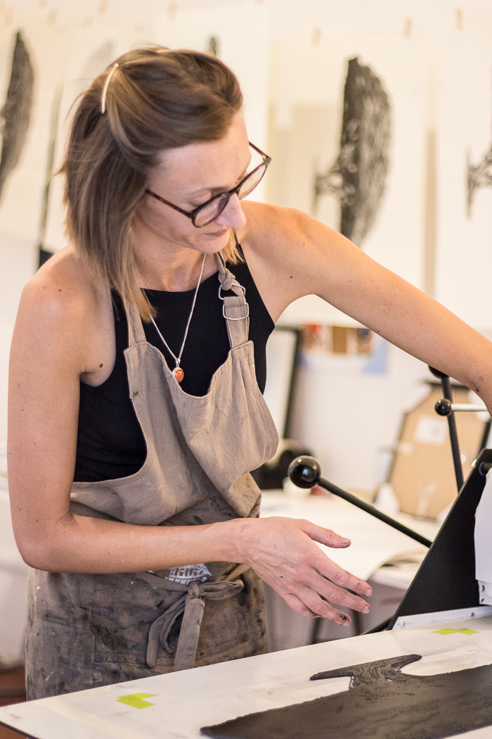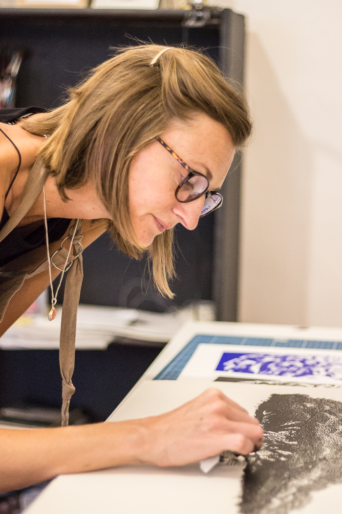 Même si les linogravures sont faites en plusieurs exemplaires, chacune reste un peu unique car elle ne s’imprime pas tout à fait de la même manière sur le support.