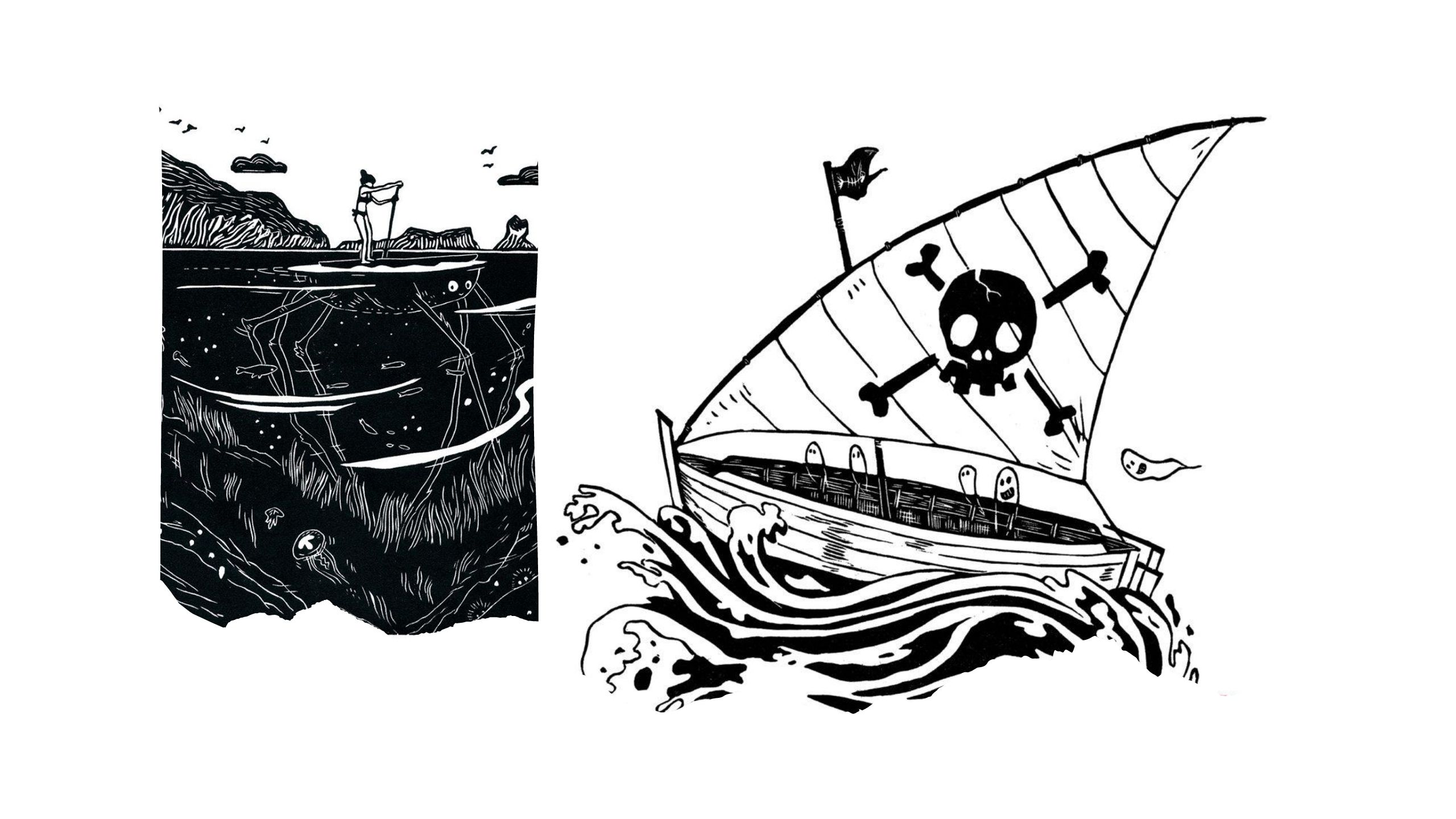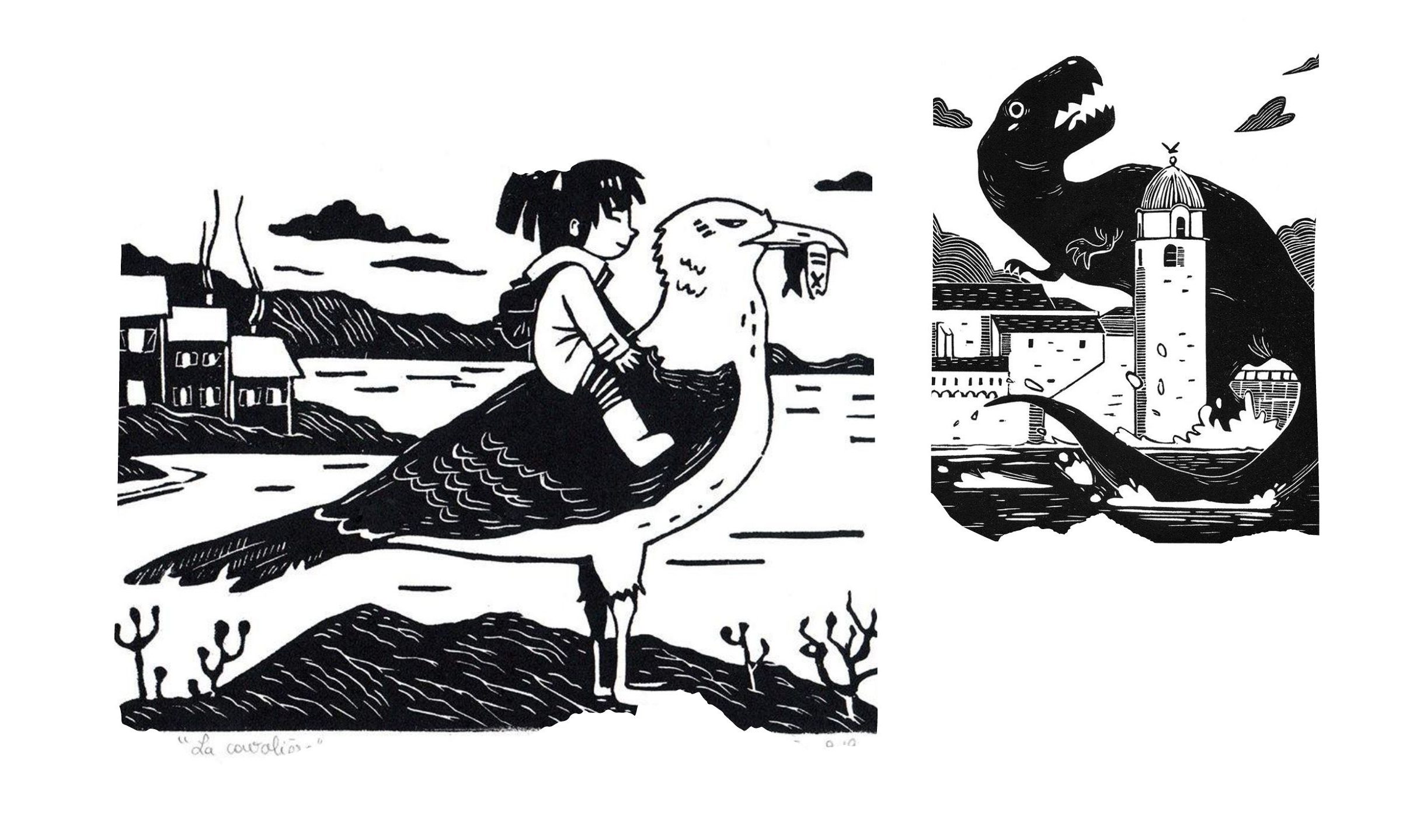 Avec ses impressions en Noir & Blanc, très graphiques, elle imagine tout un monde onirique. De Collioure au Cap Béar, en passant par la Madeloc, c’est toute la côte Vermeille qui devient le support de ses créations. C’est ainsi que naissent des scènes surréalistes de dinosaures et de poulpes prenant d’assaut l’église Notre-dame-des-Anges, monument emblématique de Collioure. Elle intègre d’étranges mais sympathiques monstres marins et des bateaux pirates au creux des vagues de la Méditerranée…