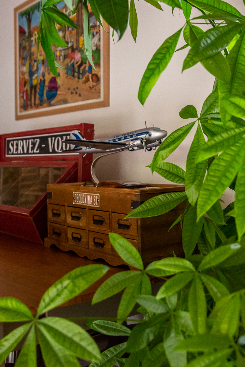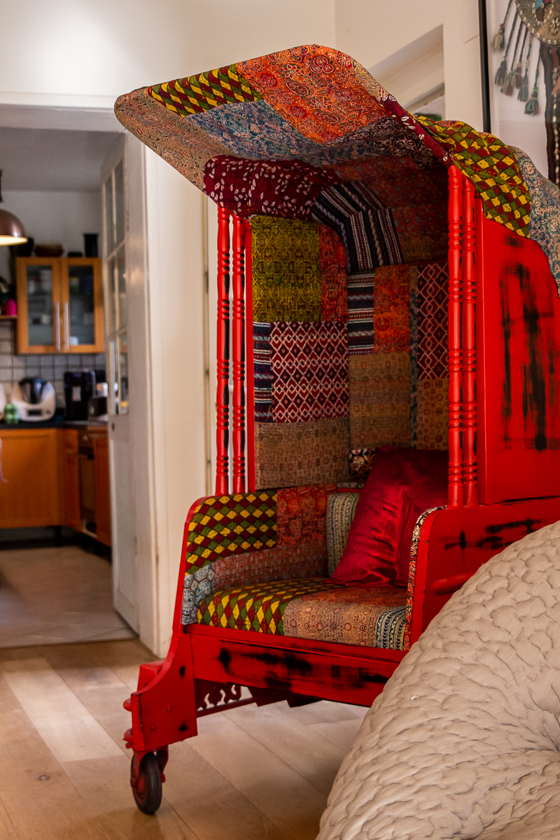 Dans le salon, deux chats majestueux flânent près d’un rayon de soleil qui filtre par la fenêtre, tandis que le chien réclame quelques caresses. Les murs sont parsemés de livres, de photos d’art, et on découvre même un authentique tuk-tuk coloré près du canapé.