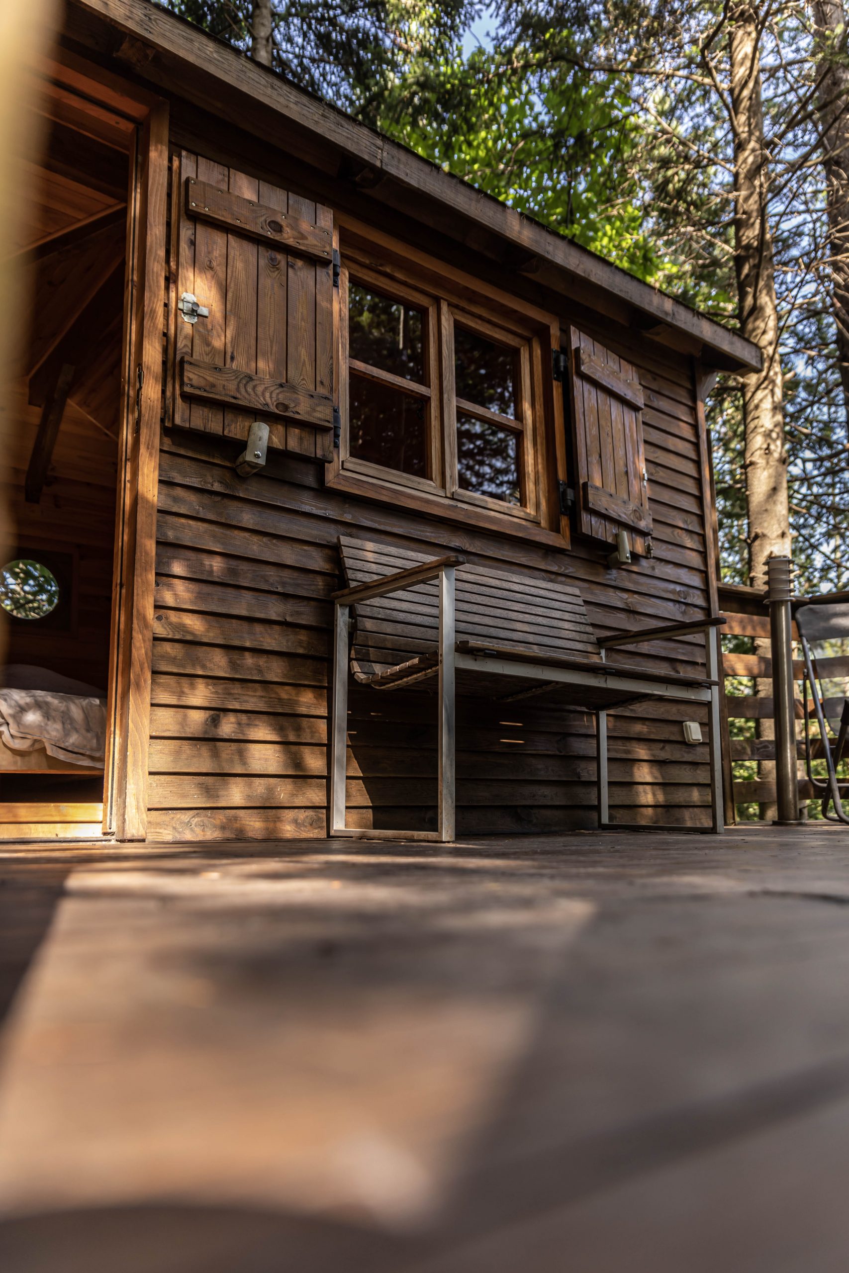 Situées sur un ancien parcours d’Accrobranche, les installations ont été réhabilitées pour devenir des logements insolites. Ainsi, le domaine propose plusieurs types d’hébergements. Nous avons dormi dans la petite cabane « Mélèze », perchée sur pilotis.