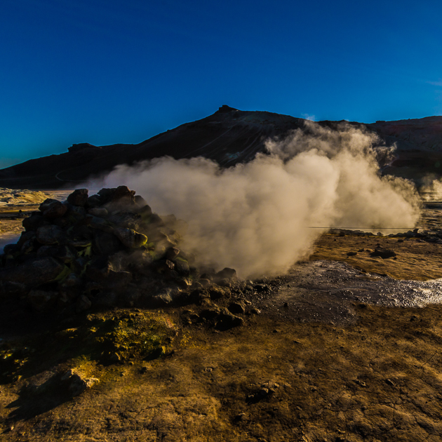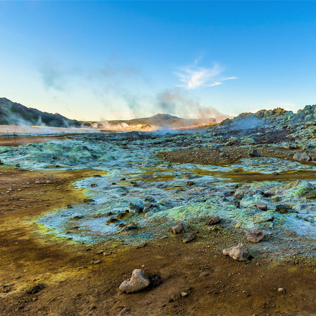 Surplombé par les crêtes du mont Námafjáll, le paysage semble venir tout droit d’une autre planète, avec ses nuances saturées ocres et bleues.