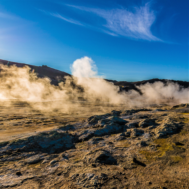 Hverir est un secteur géothermique qui grouille d’activité : on peut y observer des colonnes de vapeurs, des solfatares, des marmites de boue bouillonnantes… Un petit sentier traverse le site, et il est vivement conseillé de ne pas s’en écarter, au vue du sol qui bouillonne aux alentours.